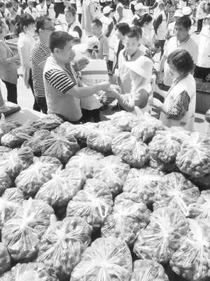 当日,周口晚报记者在市区八一大道与文昌大道交叉口东北角发放现场看到,大枣已经被义工平均分装到1200多个塑料袋中,整齐堆放在一起。上午9时,环卫工闻讯赶来,从义工手中接过大枣时,他们的脸上都露出了开心的笑容。