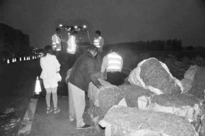 3时40分,事故车辆被拖离现场。随后,林鑫和李亮亮又联系车辆,并与路政及救援人员一起连夜将撒落的近4吨货物装上车(如图)。