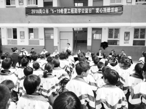 本报讯 5月19日,团市委组织第六届周口杰出(优秀)青年代表、女童保护志愿者走进商水县大武乡北极星学校,开展“5·19希望工程助学公益日”捐赠活动,为学生送去爱心礼物——“希望书屋”。