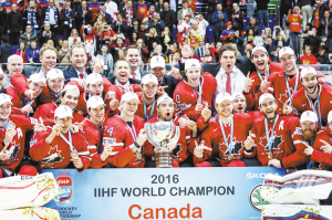 当地时间5月22日,加拿大队在颁奖仪式上庆祝。当日,在2016年IIHF世界冰球锦标赛决赛中,加拿大队以2∶0战胜芬兰队,成功卫冕。新华社发