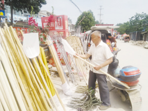“你应该知道,原来每一家的农具差不多能堆满一间屋子。比如说,麦忙的时候,全家人都要下地割麦,镰刀每人一把,挑麦秧子堆垛时三股杈五六把,扫帚两三把,扬场木锨两三把,还需要推麦籽用的推把,挑麦糠用的扬杈……20年前,他摊位上的每种农具我都要买一些,弄得满屋子堆的都是。10年前,种地不用牛了、割麦不用人了,农具就简单多了,农活也轻松多了。现在,从耕到种再到收都是机械化,买把杈,收割机来的时候帮衬着挑一挑倾斜的麦秧子;买把镰刀,把路边、沟边收割机收不到的麦子割下来就行了;买把木锨,装麦籽的时候能用上。就这样,3样农具过麦季儿。”刘继宏一边挑选(如图)一边介绍20年来农具的变迁。挑好农具付了钱,刘继宏轻松地一笑向我招了招手:“走,咱把农具先送回家,然后再去地里看看。”