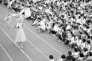 5月25日,江苏扬州木偶剧团演员在江都区城北幼儿园为孩子们表演木偶戏。