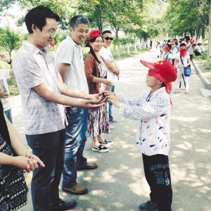 活动分为上午场和下午场,内容自始至终围绕一个鸡蛋愉快展开。在齐心协力运鸡蛋、小心翼翼护鸡蛋、心心相印送鸡蛋三个环节,小记者与家长密切配合,步调一致,顺利完成一项又一项挑战。在活动现场,生鸡蛋、红领巾、油彩、笑脸、呼啦圈、趾压板、任务书……这些极其普通的物品被小记者演绎得富有无限活力和生机。以三个间隔放置的呼啦圈为标志的障碍物,映照出每个家庭的团结协作能力。在这里,鸡蛋可不是简单的鸡蛋,它被赋予了深刻的意义——一个生命的象征、一段生命的旅程。整个过程中,飞天队、霹雳队、奔跑队等群情激昂,口号声、欢呼声此起彼伏。