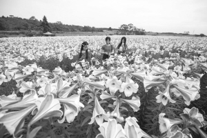 5月28日,游客在江西省九江市都昌县南峰镇暖湖村百合种植基地观赏百合花。