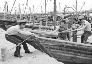 5月31日,河北省秦皇岛市公安边防支队的官兵在昌黎县七里海渔港帮助归港休渔的渔民系缆绳。