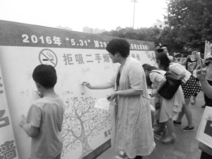 市民黄先生路过此处时,在孩子的控烟签名卡上重重地写下了自己的名字。“两年前,我就戒烟了,吸烟对孩子的危害真得很大,早点戒烟有益健康。今天是无烟日,这些孩子走上街头宣传控烟知识,真令人欣慰。”黄先生说。