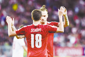 当地时间5月31日,奥地利队球员舍普夫(前)与队友庆祝进球。当日,在奥地利南部城市克拉根福举行的一场国际足球友谊赛中,奥地利队以2∶1战胜马耳他队。