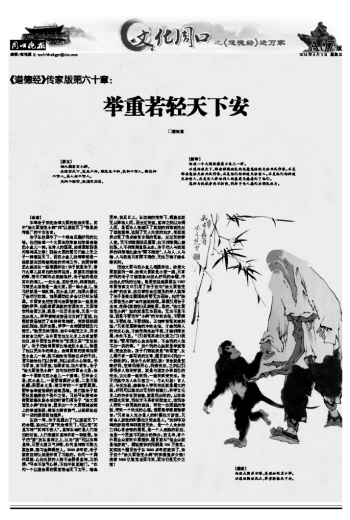 本章老子讲述治理大国的政治主张。其中“治大国若烹小鲜”和“以道莅天下”都是流传甚广的千古名言。