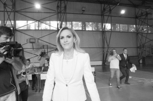 6月5日,在罗马尼亚首都布加勒斯特,由社会民主党推出的布加勒斯特市长候选人、参议员加布里埃拉·菲雷亚在投票后离开投票站。