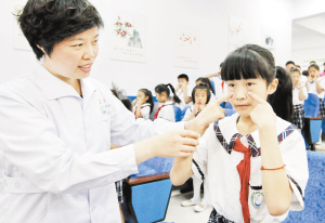 6月6日,医护人员在邢台市龙泉小学指导学生做眼保健操。