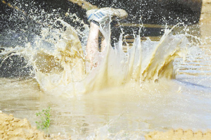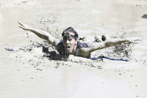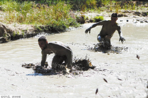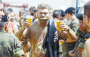 2016年6月11日,西班牙马德里郊外的El Goloso军事基地,民众参加“泥浆日”障碍赛跑,摸爬滚打变“泥人”。
