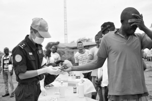 当日下午,中国第四支驻利比里亚维和警察防暴队一级医院的医护人员深入蒙罗维亚自由港港区,开展“你我携手·共护健康”义诊活动。防暴队一级医院的医护人员携带便携式医疗器械及常用药品为港区工作人员进行体检,宣讲埃博拉、疟疾等传染性疾病防范常识,赠送驱蚊水、清凉油等防蚊药品,并将检查结果详细记录,交给该港区负责人存档。新华社发