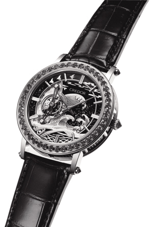 全新研发的 CH 28-520 HU 自动上弦机芯得以将世界时间和计时这两项复杂功能融为一体,结合了蓝色与银色的表盘巧妙地分布着当地时间、其他23个时区与计时功能,各项信息一目了然。