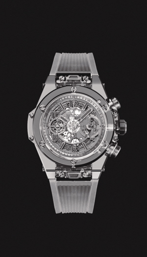 腕表由整块黑色烟熏抛光切割打造而成,以微妙平衡展现其透明属性,同时保证表壳的防磨损性能。透明手法与镂空结构的融合,将Unico自产机芯的运作展露无遗。