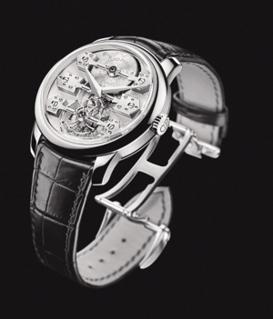 以腕表形式复刻了1889年的一款三金桥陀飞轮怀表,并将独树一帜的机芯结构呈现在表盘上,由纯金的条夹板、齿轮系桥和陀飞轮夹板制成的主板尤为醒目。