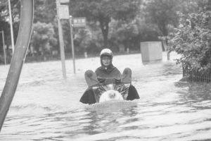 6月14日,市民在柳州市西江路积水中骑车出行。