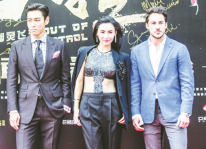 本报综合消息 6月14日下午,中德合拍动作片《失控·幽灵飞车》在上海电影节期间举办新闻发布会。韩国Bigbang组合成员T.O.P崔胜铉(左)、张柏芝(中)等主创亮相造势。