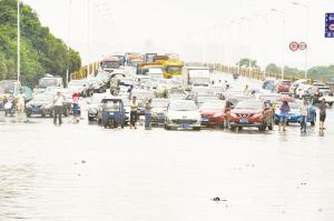 湖南株洲市主城区石峰大桥因暴雨导致交通受阻(6月15日摄)。