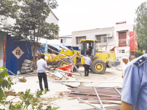 面对整治过程中不断冒出的违章建筑物,小型铲车已难以应付一些困难和复杂的场面,城管队员临时抽调了一辆大型铲车前来助阵。在五一南路麒麟建材市场附近,就有大大小小十多间违章房(棚)和多个非法广告牌。城管队员充当搬运工,不时进进出出,帮店主抬出全部物品后,铲车上场轻轻一挑、一拉、一拽,一间间看似坚硬牢固的简易房便应声倒下。