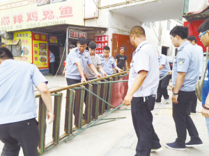 本报讯 压弯的铁架、横七竖八的钢板、被切割的简易板房,到处凌乱不堪,让人差点误以为闯进了某动作大片的拍摄现场,事实上这是城管队员依法拆除违章建筑物的现场。6月15日上午,市经济开发区城管局联合辖区办事处、公安等部门200余人,对五一路(黄河路至开元大道段)进行大规模集中整治,其中道路两侧的违章建筑物是此次整治行动的重点。