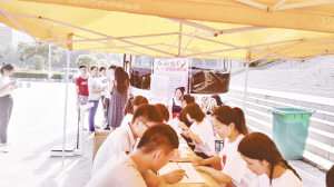 6月14日是第13个世界献血者日,周口科技职业学院近200学生参加了无偿献血活动,彰显了当代大学生热于公益事业、奉献爱心的高尚情怀。图为献血现场。