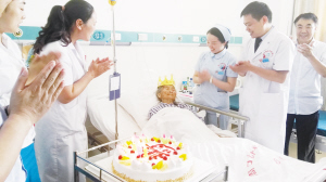 曾玉兰是周口市港务区李埠口乡赵堤村人,几天前摔伤住进周口协和骨科医院,该院院长刁庆勋为其做了手术。手术后,曾玉兰安全返回病房。图为病房过生日现场。