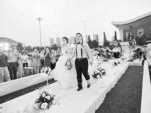 6月15日傍晚,一对新人在周口市体育中心足球场里举办了一场别出心裁的露天婚礼。晚报记者 宋风 摄