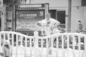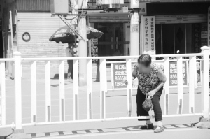 图一:八一大道上,一位大妈从护栏缝隙中穿过。