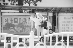 图三:七一路上,一位妙龄少女不顾个人形象翻越护栏。