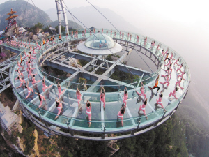 6月20日,瑜伽爱好者在石林峡景区飞碟玻璃观景平台上练习瑜伽。