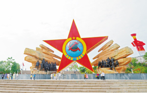 游客在位于江西瑞金的中华苏维埃纪念园景区红五星广场游览(2015年10月2日摄)。