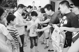 在给学生发放物品时,跑步团成员李晓明看到孩子们满头大汗,当即拿出500元让校长给他们买西瓜降暑解渴。