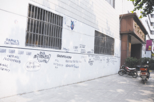 6月22日,周口晚报记者看到,周口中心城区中州大道上的中国人民银行周口分行大门口,雪白的墙面上写满“牛皮癣”,很是扎眼。市民呼吁有关部门及时清除。