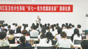 6月23日,为庆祝中国共产党建党95周年,深入推进“两学一做”学习教育,提升卫生计生系统党组织的号召力、凝聚力和战斗力,激励广大党员坚定理想信念、树立群众观点、增强服务意识、立足本职岗位、发挥党的先锋模范作用,川汇区卫计委举行“庆七一 我为党旗添光彩”演讲比赛,并重温入党誓词。川汇区卫生计生系统150多人参加了活动。图为演讲比赛现场。