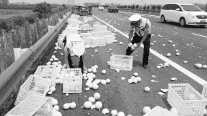 本报讯 6月22日上午,一辆满载甜瓜的轻型货车因爆胎,在新周高速131公里处发生侧翻,甜瓜滚落一地(如图),司机王某受皮外伤。市交警支队新周高速大队民警及时救助,最大限度减少了损失。