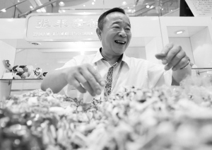 在纪念馆墙上的一张黑白照片里,张秉贵站在柜台后,身穿笔挺的工作服,手中抓着一把糖果悬在空中,微笑着看着顾客,眼睛里充满了热情。张朝和指着照片说:“父亲很简朴,但衣服、头发都会打理得整整齐齐。有一次和同学偷偷跑到柜台来看他卖货,他就像照片里这样,被顾客围在中间,真的就像‘一团火’一样温暖。”