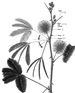 含羞草:它的茎叶中含有含羞草碱,是一种毒性很强的有机物,人体接触过多会引起毛发脱落。