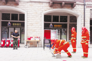 夏季高温炎热,是火灾的高发季节,为保护业主生命财产安全,6月26日下午,周口碧桂园在餐饮商业街举行消防安全演练。图为演练现场。
