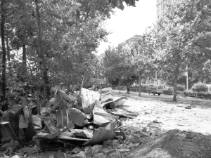 6月28日,在东新区庆丰路与府苑路丁字路口南侧,一排违章建筑被拆除许久,但路旁堆放的大量建筑垃圾却无人清理。晚报记者 朱海龙 摄