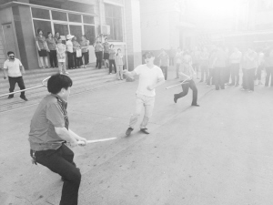 在防恐防暴的演练中,两名手持凶器的歹徒在车站大厅里转悠,车站值班站长见此情况后,想方设法稳定住两名歹徒,随后一边安排工作人员疏散候车厅内旅客,一边组织工作人员拿起警棒、防爆叉与歹徒进行搏斗(如图四)。