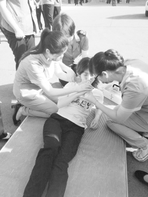 在模拟车站大厅发生火灾的演练中,车站值班站长第一时间拨通119、120求救,并组织工作人员帮助旅客有序撤离。车站医疗抢救组对撤离到安全地带的受伤旅客进行施救(如图二)。大厅内人员全部撤离后,救援人员手持灭火器迅速组织灭火(如图三)。