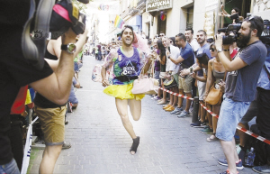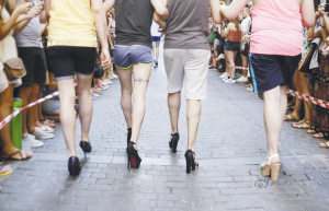 当地时间6月30日,西班牙马德里举办高跟鞋赛跑,众人跃跃欲试,部分选手不幸扭伤。