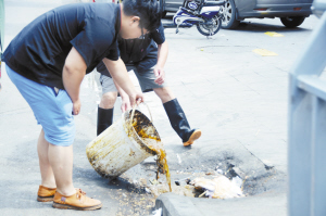 7月4日10时许,五一路与育新路交叉口附近,一家饭店的工作人员将一桶垃圾倾倒在路边下水道井盖上,瞬间污水四溢。晚报记者 朱海龙 摄