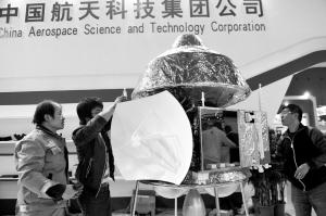 2015年11月2日,在上海举行的第17届中国国际工业博览会中国航天科技集团公司的展台上,工程人员在安装整体为金黄色的火星探测器模型。