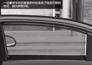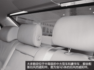 通常被配备在一些定位于中高级的中型和中大型轿车上,当然,对于豪华车来说,这应该算是个标准配置。这项配置主要的功能是为后排乘客遮挡强烈的日照与紫外线,同时也能在一定程度上增加私密性,由于它采用了打孔式的遮阳帘材质,并不会影响到驾驶者观察车辆后方情况。遮阳帘的开启与关闭按键大多数被设置在前排的中控台或车窗升降按键附近,而对于一些高端的中大型车和豪华车来说,后排乘客也可以进行控制。