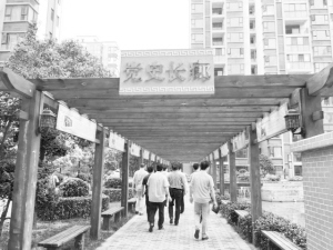 社区的“创城”宣传,有着润物细无声的效果。考察组一行首站冒雨来到文昌大道幸福花开小区,平整的沥青路、洁净的方砖小路映入眼帘;小路两旁的绿树红花相映成趣,每盏路灯的灯柱上都雕刻着老子的《道德经》,做成古典中国结形象的公益广告牌穿插在楼宇之间(图一);“爱国 敬业 诚信 友善”“勤善在手福寿缠身”等数十幅以社会主义核心价值观为主题的公益广告(图二)铺满墙面,画面中带有“中国范儿”的剪纸、瓷娃娃等形象栩栩如生,让人感受到一股扑面而来的文明新风;休闲绿色长廊摇身“变成”党史长廊,以图文并茂的形式,为群众学习党史提供阵地和平台(图三);虽然下着雨,大妈们依然在小区大门口步履轻快地跳着广场舞。