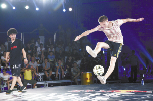 7月9日,瑞典选手埃米尔在比赛中。当日,2016红牛花式足球世界杯总决赛在北京落幕,来自瑞典的埃米尔获得总决赛的冠军。新华社记者 鞠焕宗 摄