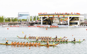 7月9日,参赛队伍在2016年新疆首届龙舟大赛上角逐。