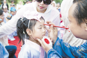 7月11日,学前儿童在吉林文庙开笔礼活动上参加“朱砂开智”仪式。
