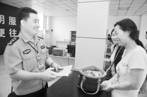为保证受理、发证工作顺利进行,出入境管理部门采取有效措施,全员上岗,加班加点,全力做好各项服务工作。图为民警为群众办理港澳通行证签证。